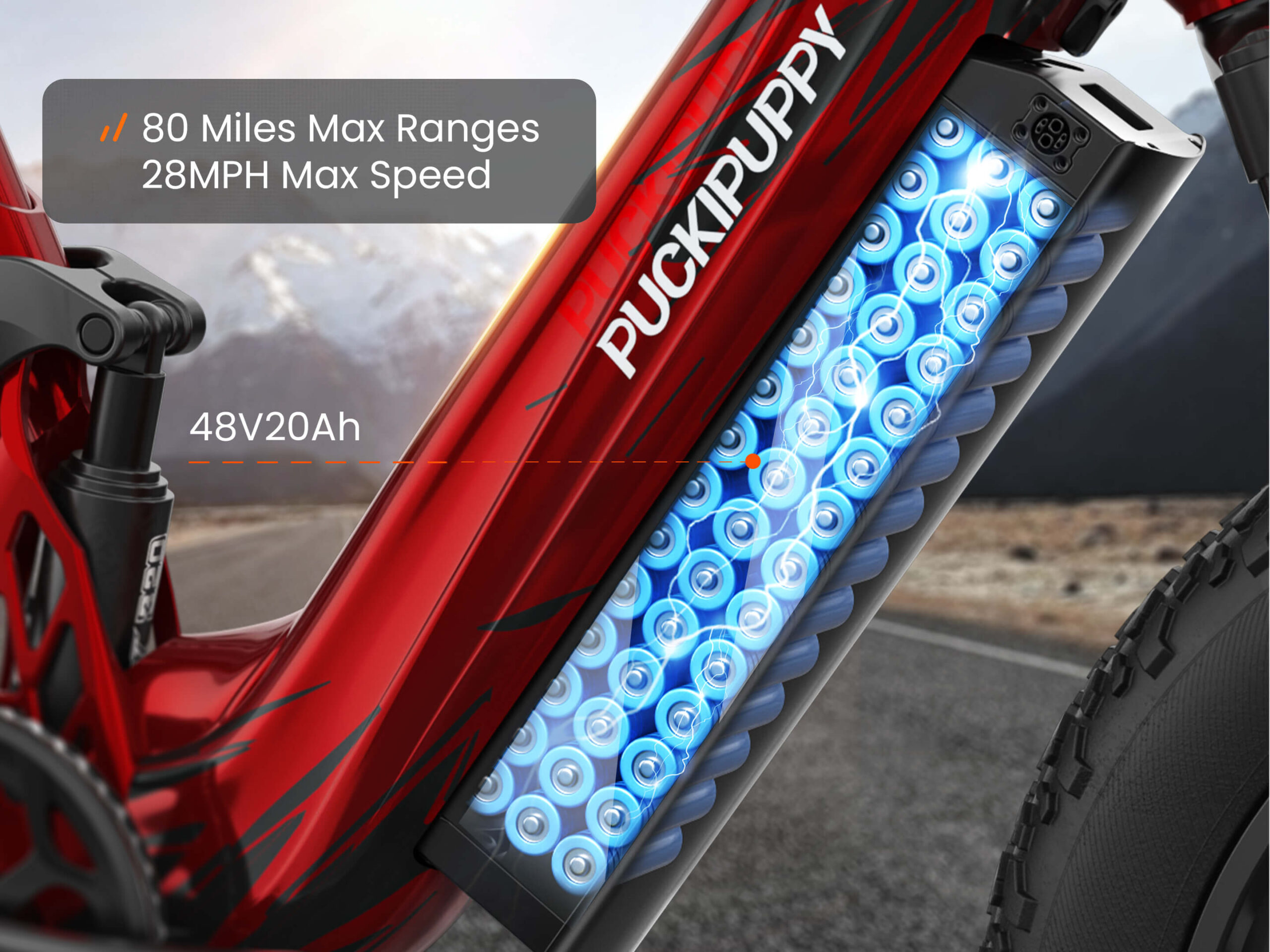 - Съёмный аккумулятор 48 В 20 А·ч с максимальным запасом хода до 80 миль.