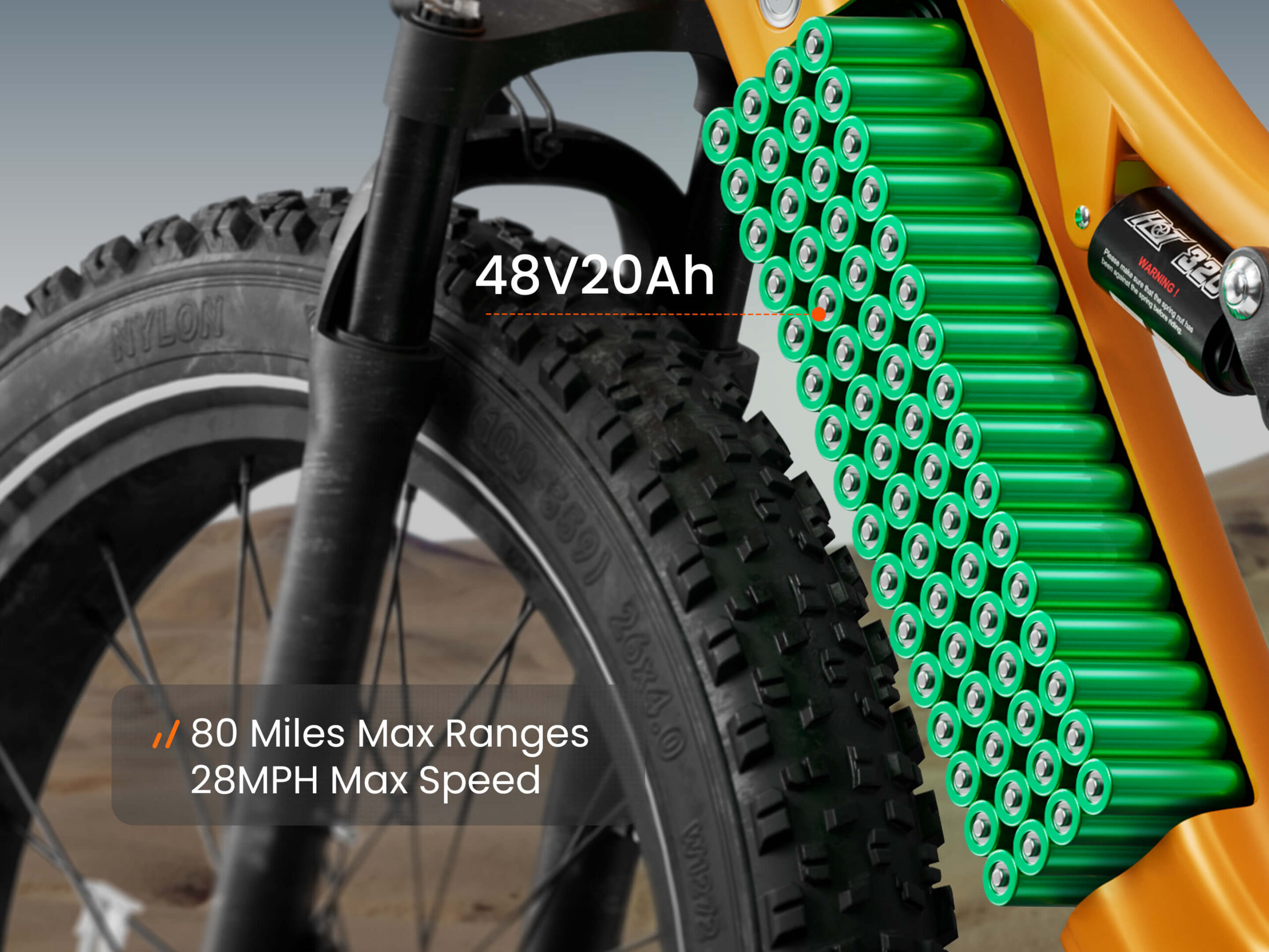 • Съёмный аккумулятор 48 В 20 А·ч с максимальным запасом хода до 80 миль.